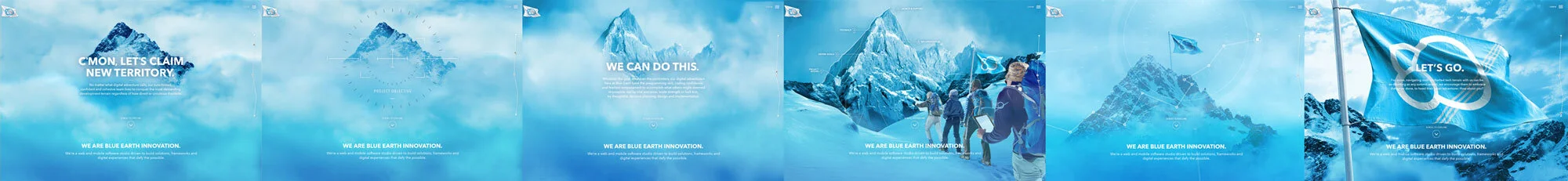 Partnering with the brand strategists at Inkubator, we set out to develop a refined brand position. A lot of discussions, discovery sessions and research ensued. At its core, Blue Earth is a trusted digital partner, sure footed, yet not afraid to innovate when that is what’s required to deliver the right solution. “Blue Earth: Digital Adventurers” staked out their position perfectly. They provide the means and the expertise to guide their clients to whatever heights they set their sights on. To a client, each new interactive project is a thrilling new adventure, but Blue Earth's intrepid developers have scaled those slopes many times before and have the sure-footedness to navigate the pitfalls and hazards.